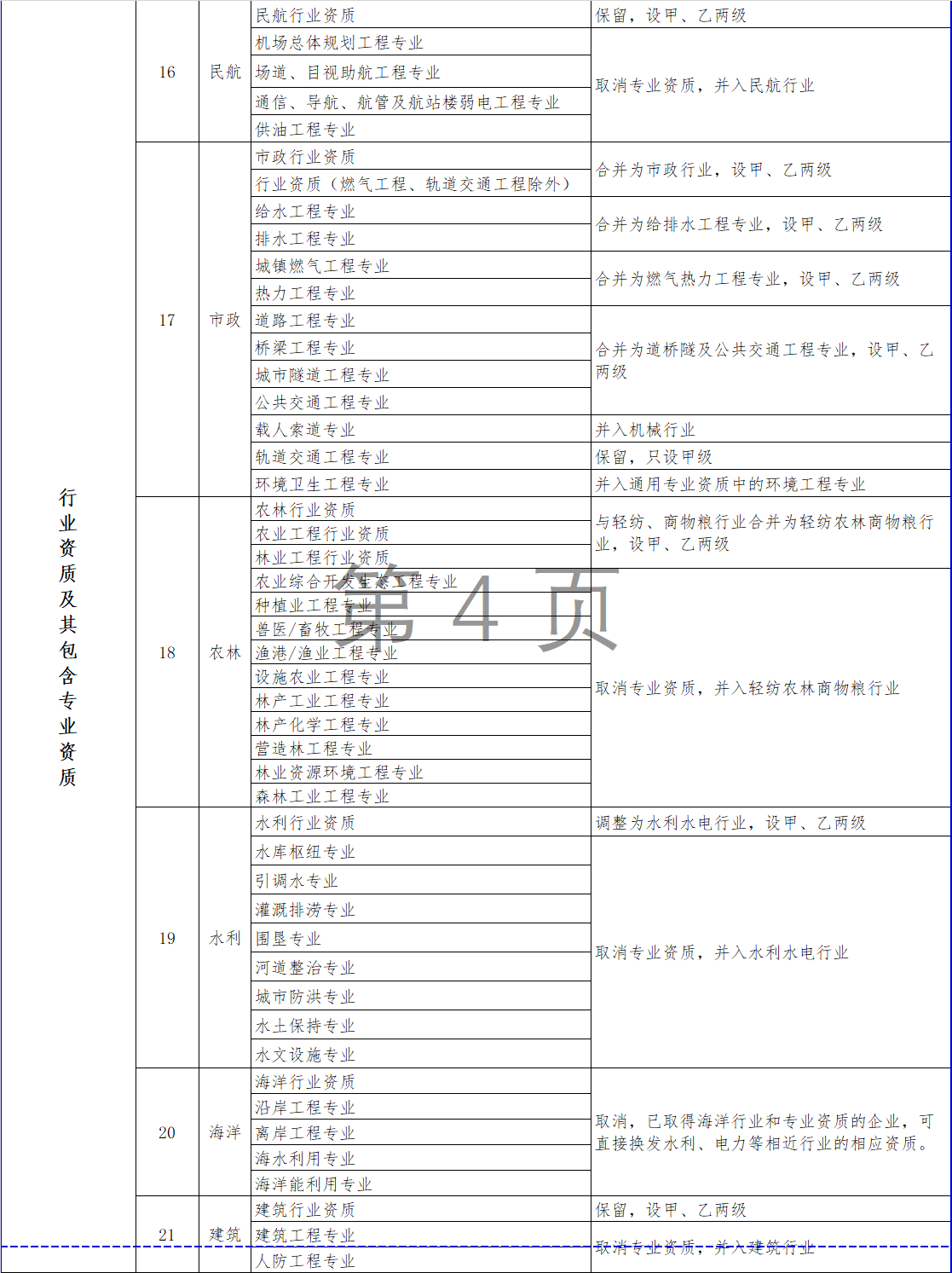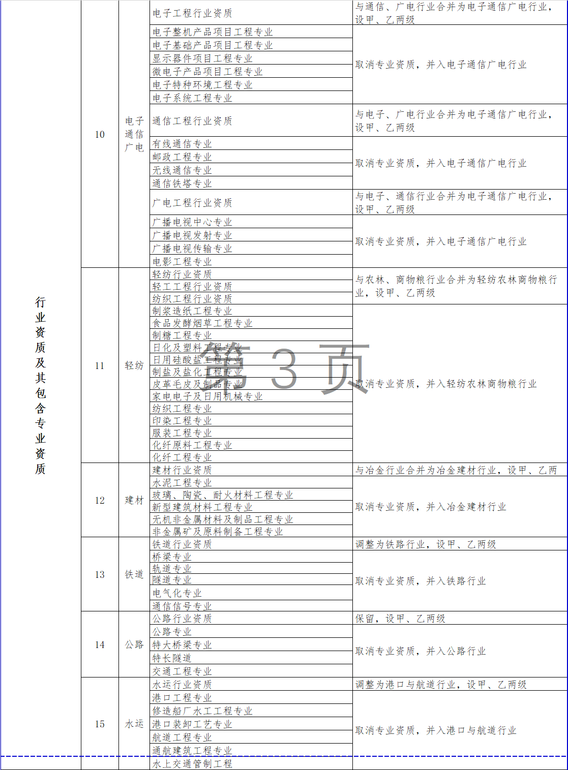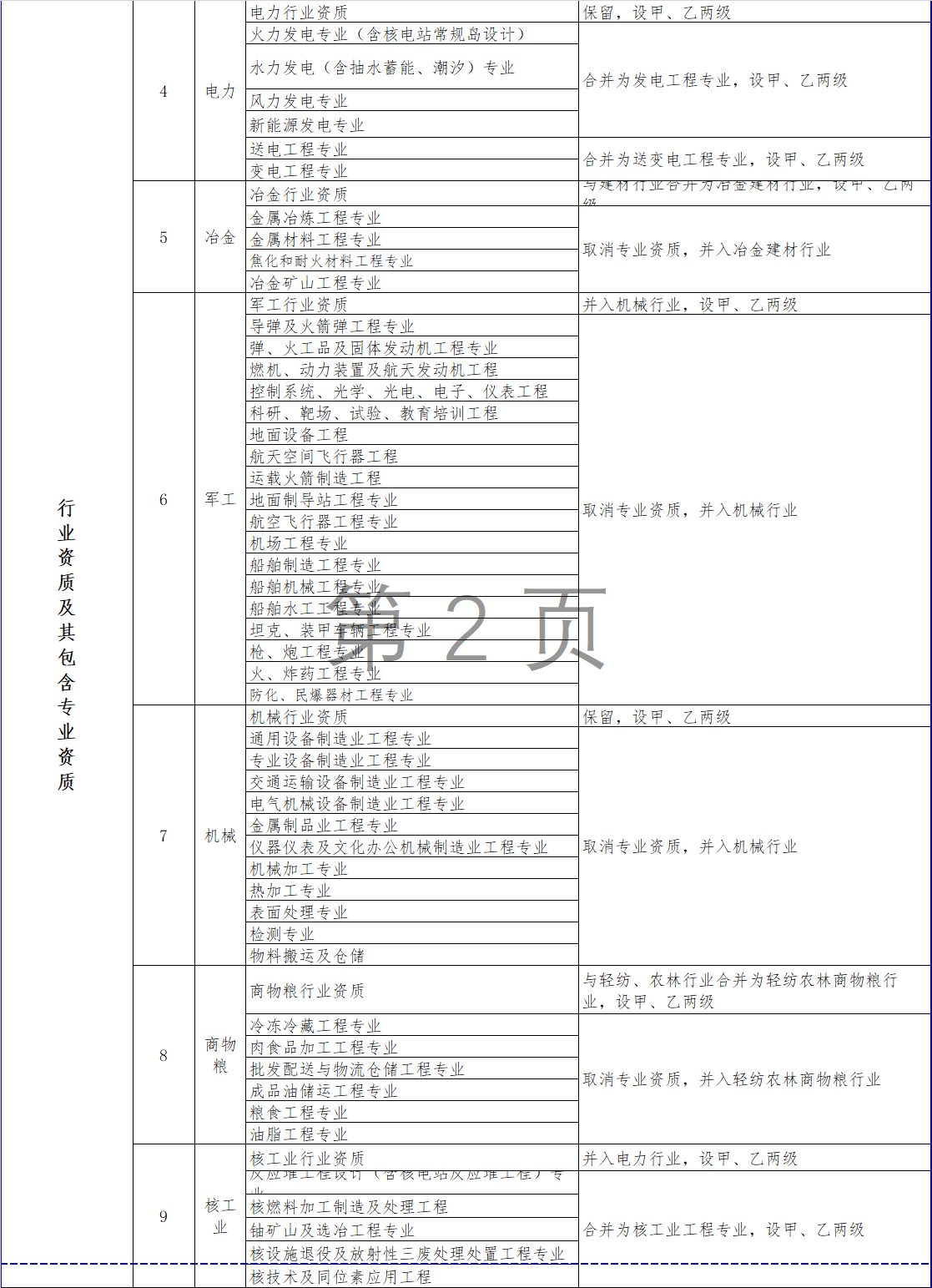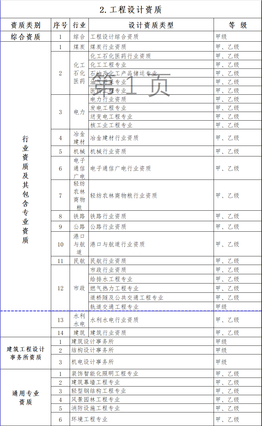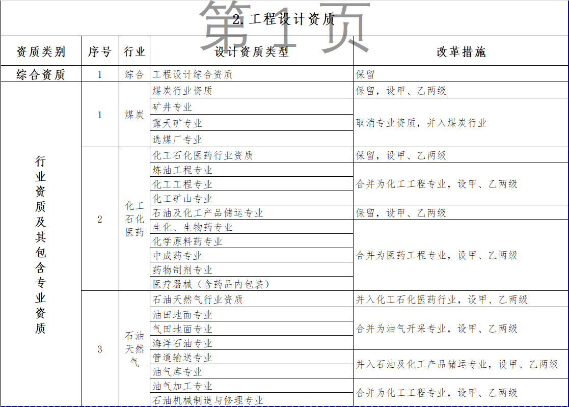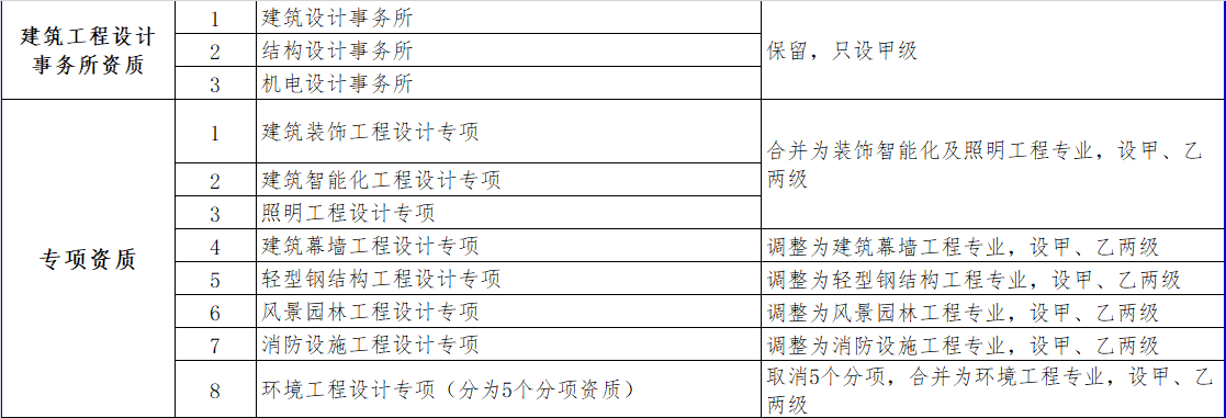 (二)工程設(shè)計資質(zhì)。保留綜合資質(zhì)。對部分行業(yè)資質(zhì)進(jìn)行整合,其中,冶金行業(yè)與建材行業(yè)合并為冶金建材行業(yè)資質(zhì),輕紡行業(yè)、農(nóng)林行業(yè)、商物糧行業(yè)合并為輕紡農(nóng)林商物糧行業(yè),電子行業(yè)、通信行業(yè)、廣電行業(yè)合并為電子通信廣電行業(yè),石油天然氣行業(yè)并入化工石化醫(yī)藥行業(yè),軍工行業(yè)并入機(jī)械行業(yè),核工業(yè)行業(yè)并入電力行業(yè),資質(zhì)等級壓減為甲、乙兩級,原丙級資質(zhì)并入相應(yīng)行業(yè)乙級資質(zhì)。取消海洋行業(yè)及專業(yè)資質(zhì),相關(guān)企業(yè)可以換發(fā)相近行業(yè)資質(zhì)。整合原化工石化醫(yī)藥、石油天然氣、電力、市政行業(yè)中的專業(yè)資質(zhì),資質(zhì)等級壓減為甲、乙兩級,原丙級資質(zhì)并入相應(yīng)專業(yè)乙級資質(zhì);取消其他行業(yè)的專業(yè)資質(zhì),并入相應(yīng)行業(yè)資質(zhì),原甲、乙級專業(yè)資質(zhì)并入相應(yīng)等級的行業(yè)資質(zhì),原丙級專業(yè)資質(zhì)并入乙級行業(yè)資質(zhì)。將專項資質(zhì)調(diào)整為通用專業(yè)資質(zhì),取消環(huán)境工程專項資質(zhì)的5個專項類別,整合為環(huán)境工程專業(yè)資質(zhì),資質(zhì)等級壓減為甲、乙兩級,原丙級資質(zhì)并入相應(yīng)專業(yè)乙級資質(zhì)。保留3類事務(wù)所資質(zhì)。