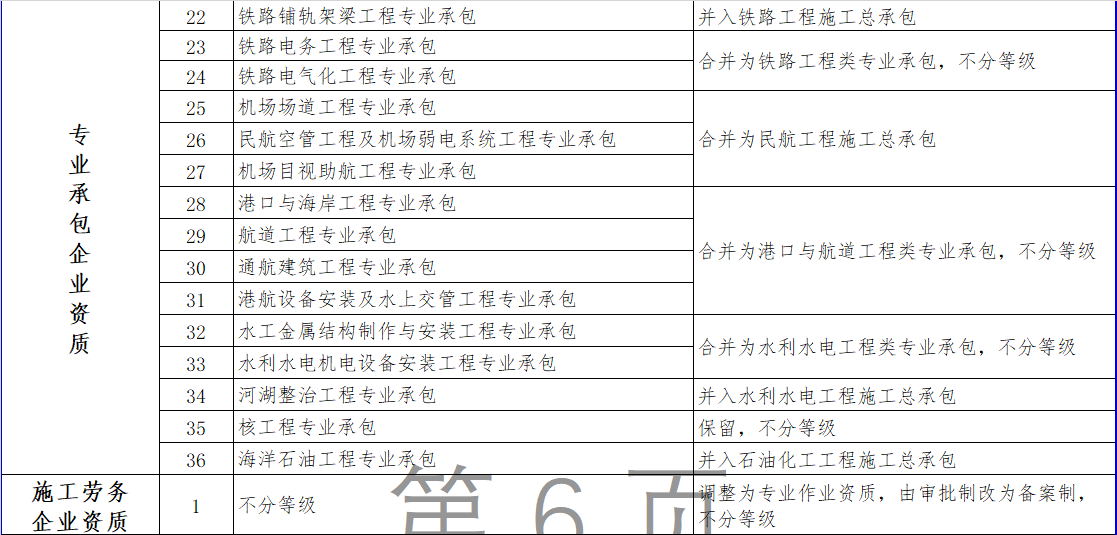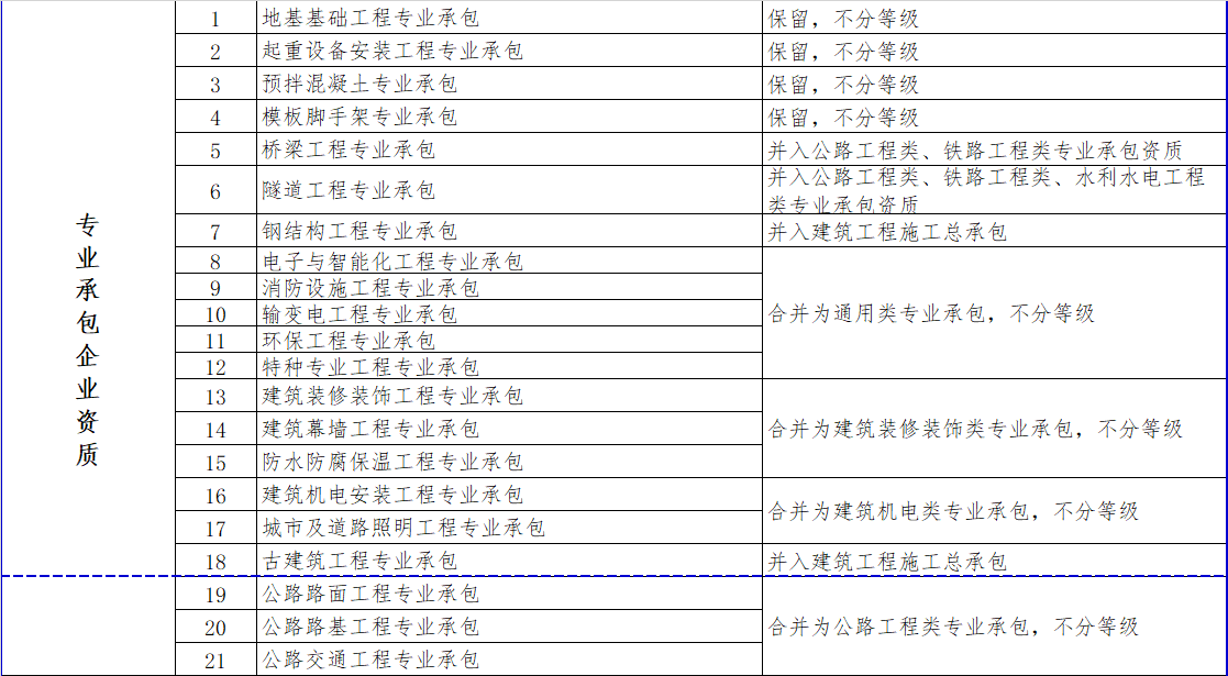 保留地基基礎(chǔ)工程、起重設(shè)備安裝工程、核工程等專業(yè)承包資質(zhì);將原專業(yè)承包資質(zhì)整合為建筑裝修裝飾類、建筑機(jī)電類、公路工程類、港口與航道工程類、鐵路工程類、水利水電工程類、通用類專業(yè)承包資質(zhì);專業(yè)承包資質(zhì)不分等級。