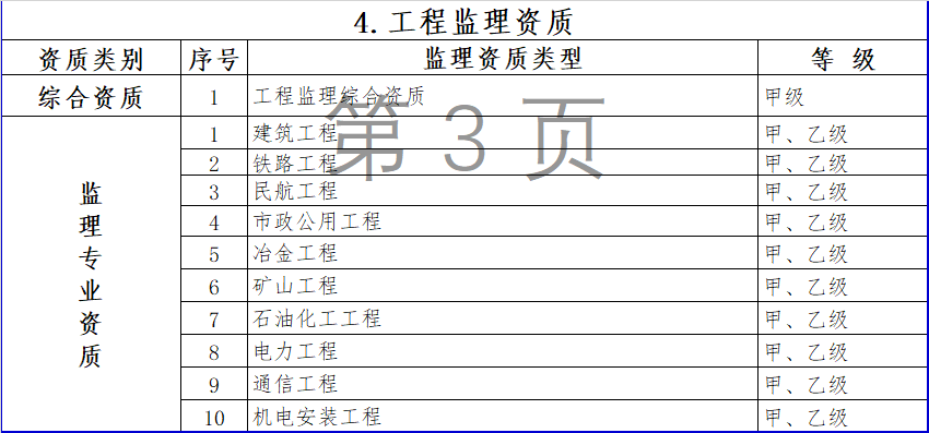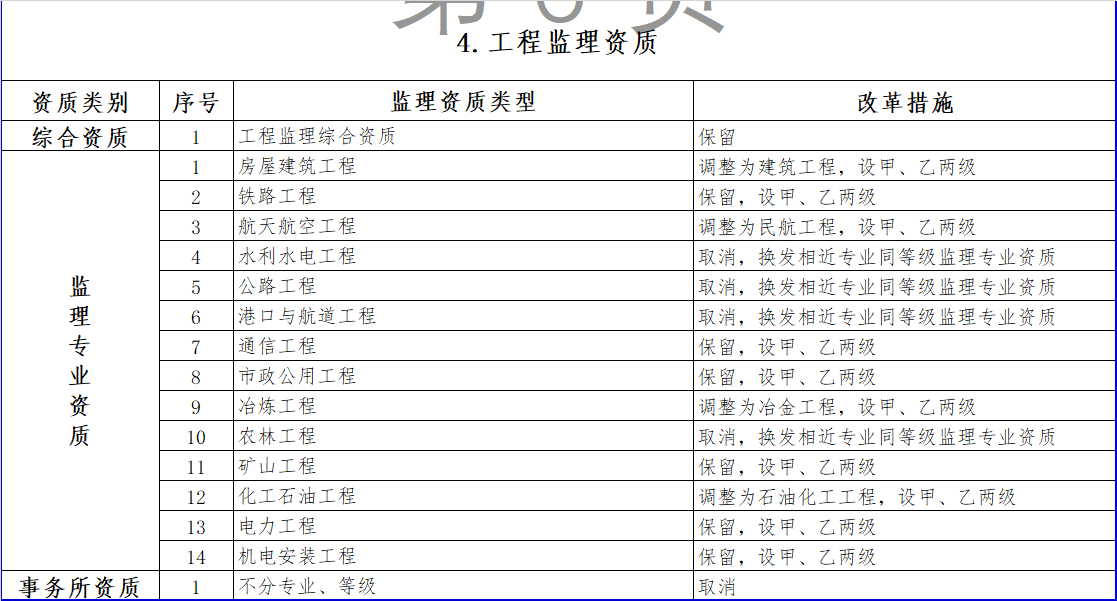 (四)工程監(jiān)理資質(zhì)。保留綜合資質(zhì)。取消水利水電工程、公路工程、港口與航道工程等專業(yè)資質(zhì),其資質(zhì)要求執(zhí)行有關(guān)行業(yè)主管部門規(guī)定。取消農(nóng)林工程監(jiān)理資質(zhì),建設(shè)單位委托農(nóng)林工程監(jiān)理業(yè)務(wù)時,不再作資質(zhì)要求。上述4個監(jiān)理專業(yè)資質(zhì)取消后,相關(guān)企業(yè)可以換發(fā)相近專業(yè)同等級監(jiān)理專業(yè)資質(zhì)。監(jiān)理專業(yè)資質(zhì)等級壓減為甲、乙兩級,原丙級資質(zhì)并入相應(yīng)專業(yè)的乙級資質(zhì)。取消事務(wù)所資質(zhì)。