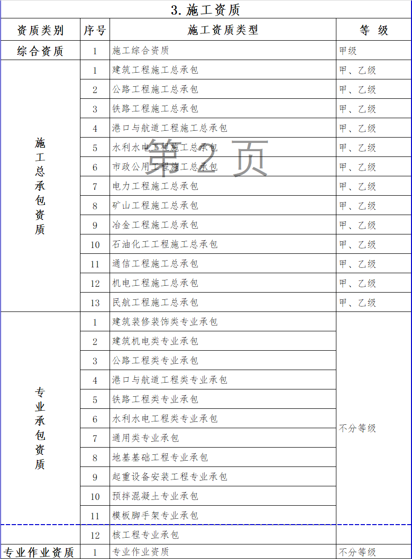 (三)施工資質(zhì)。將施工總承包特級資質(zhì)調(diào)整為施工綜合資質(zhì),取得原10類施工總承包特級資質(zhì)中的任一類,即可換發(fā)綜合資質(zhì)。取得綜合資質(zhì)的企業(yè),可承擔(dān)各類別、各等級施工總承包業(yè)務(wù),不再申請或持有其他施工資質(zhì)。