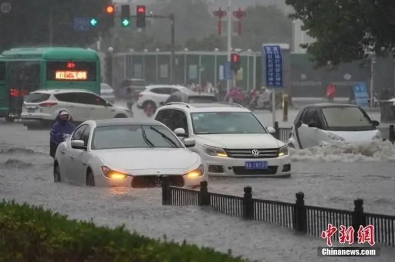 7月20日,河南鄭州,車輛經(jīng)過積水路段。近日,鄭州連遭暴雨襲擊,持續(xù)強降雨導致部分街道積水嚴重。