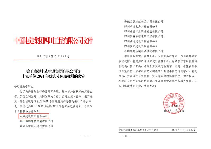 2022年7月8日,中威集團在中國電建集團四川工程有限公司2022年合作方交流會上榮獲“優(yōu)秀分包商”榮譽稱號。中國電建集團四川工程有限公司2021年度共有分包商324家,經(jīng)綜合評定,選出年度優(yōu)秀分包商10家,中威集團名列其中,董事長白德欣應邀參加表彰大會并做了發(fā)言。發(fā)言中,白德欣對于在工作中給予中威集團大力支持的中國電建集團四川工程有限公司及業(yè)內(nèi)同仁表示了感謝,與大家分享了中威集團獲獎的喜悅心情,并就項目建設中工程款墊付、進度及竣工結算、國際國內(nèi)多種因素對經(jīng)濟形勢的影響等做了分析。