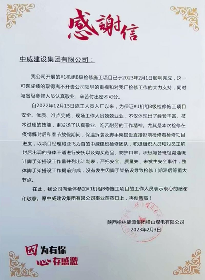 喜訊 | 陜西榆林能源集團有限公司授予中威建設集團“先進集體”榮譽稱號并發來感謝信